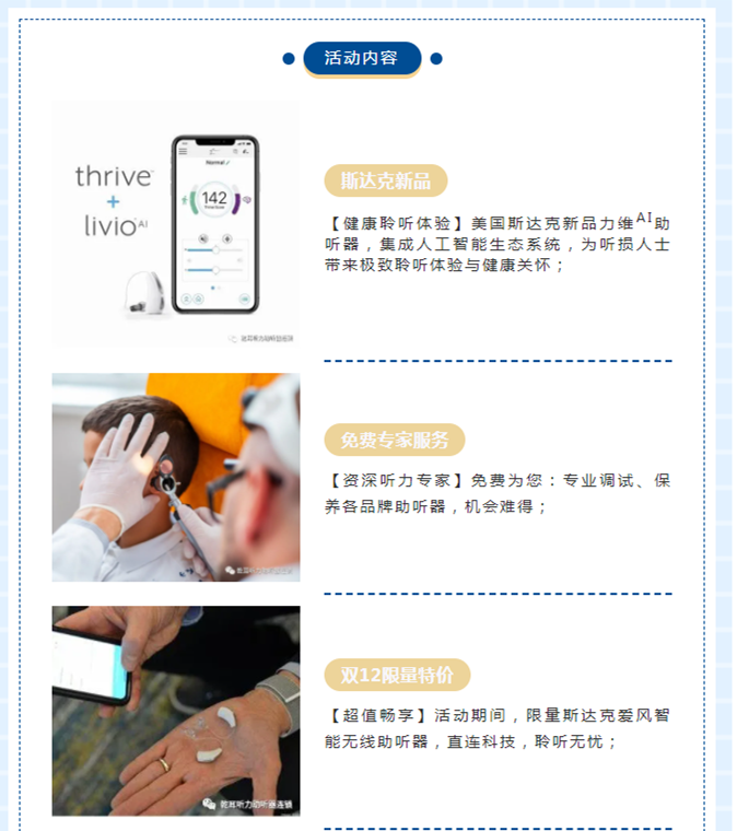 聽見真實,享受健康!12月11~12日,斯達(dá)克高級專家陳學(xué)年先生將在乾耳聽力熱河路旗艦驗配中心為聽友們帶來全新聆聽感受,鉅惠助您享受更美妙的聲音! 臨近歲末,聲音讓彼此的距離接近,聽取這美好時光! 專家介紹 陳學(xué)年 國家標(biāo)準(zhǔn)化管理委員會助聽器標(biāo)準(zhǔn)編寫委員會成員全國人工耳蝸專業(yè)委員會專家顧問IHS國際聽力協(xié)會會員 人力資源和社會保障部助聽器驗配師職業(yè)資格認(rèn)證培訓(xùn)導(dǎo)師及考評專家 斯達(dá)克高級專家曾參與多部高等院校聽力學(xué)著作的編寫,在權(quán)威聽力學(xué)期刊上發(fā)表多篇相關(guān)學(xué)術(shù)論文。歷任斯達(dá)克中國公司生產(chǎn)、運(yùn)營、市場、培訓(xùn)等部門的領(lǐng)導(dǎo)工作,長期從事助聽器技術(shù)的培訓(xùn)工作,是目前國內(nèi)聽力行業(yè)著名的助聽器技術(shù)培訓(xùn)專家,在助聽器的驗配和調(diào)試方面具有豐富的臨床經(jīng)驗。 活動內(nèi)容